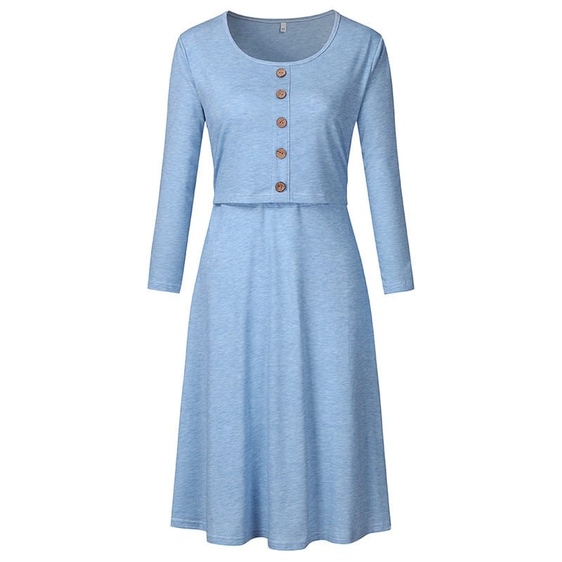 Explorez notre robe d’allaitement bleue à manches longues avec un col rond. Conçue en un tissu doux et aéré, cette robe est idéale pour les mamans actives qui souhaitent allaiter simplement et en toute discrétion. Vous vous sentirez sophistiquée !