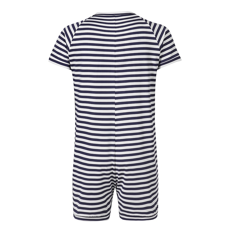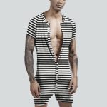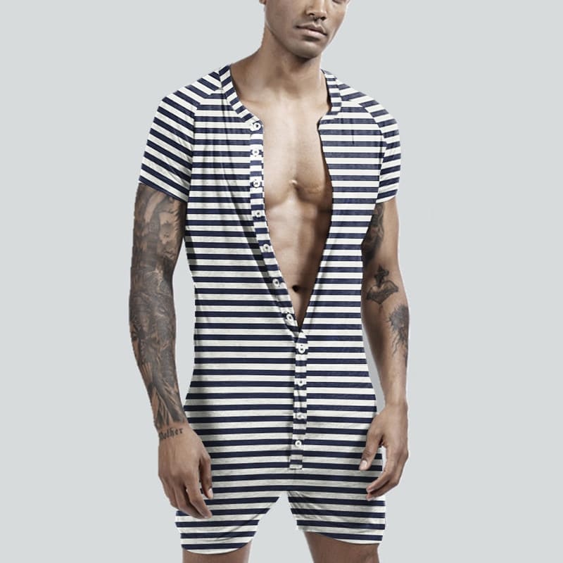 Ce combishort rayé masculin s’inspire des rayures marines bleu et noir. Ce modèle de pyjama est à jambes courtes, avec une fermeture à boutons sur le devant, conçu en coton ultra-doux.