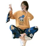 Découvrez un magnifique ensemble de pyjama féminin aux couleurs de Donald. Ce pyjama en deux pièces: un haut jaune et un pantalon bleu, agrémenté de motifs variés de Donald et Mickey, vous plongera chaque soir dans la féerie de Disney. Nous vous souhaitons des nuits merveilleusement étoilées.