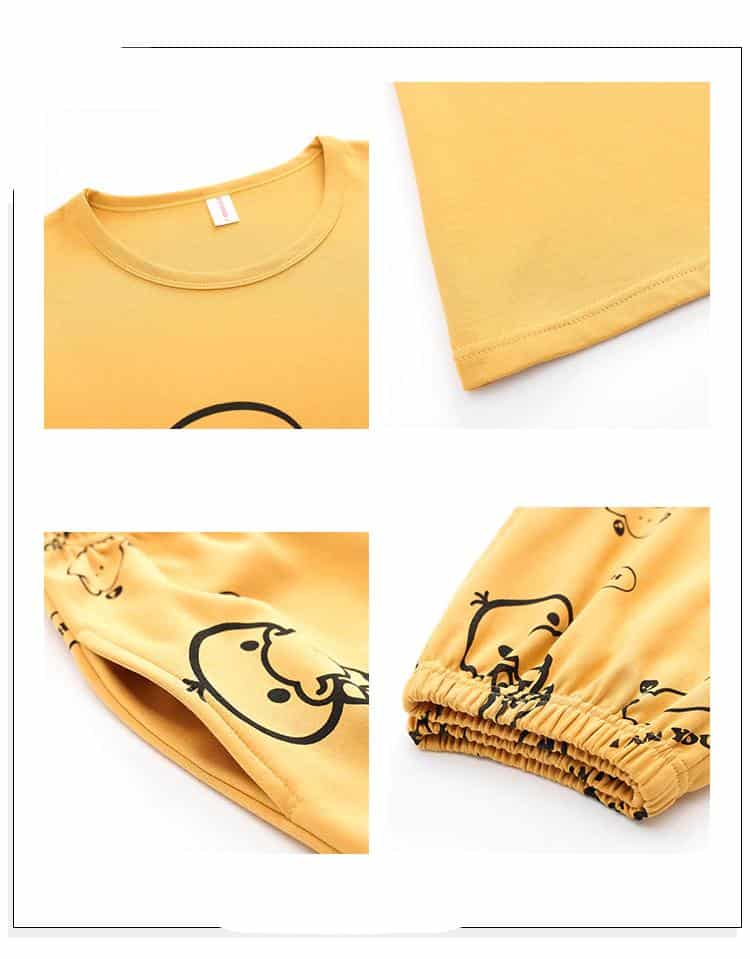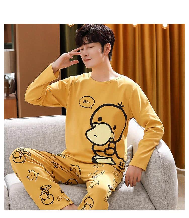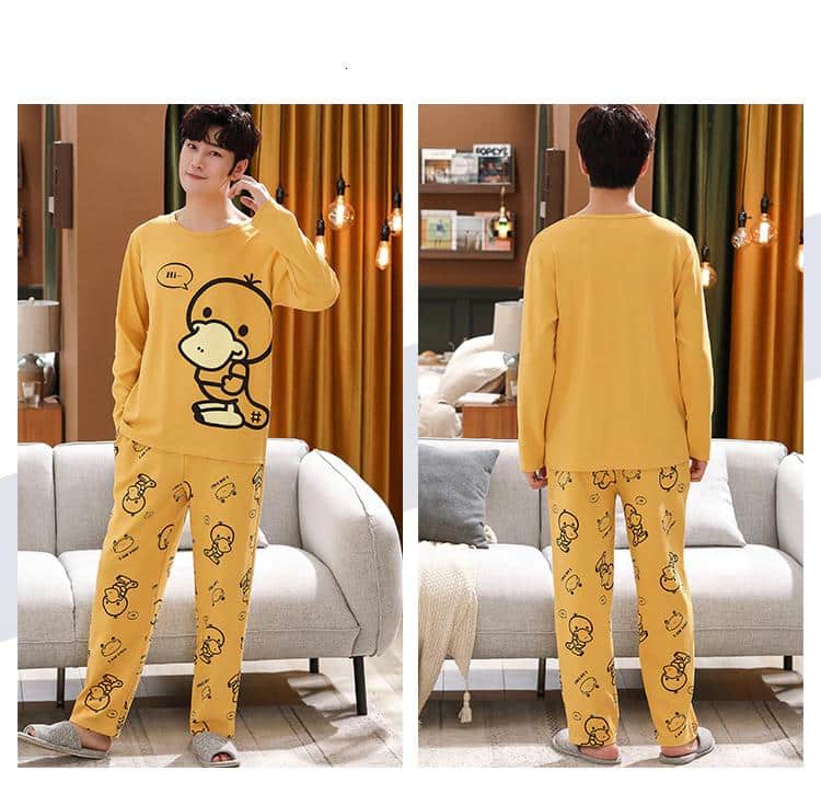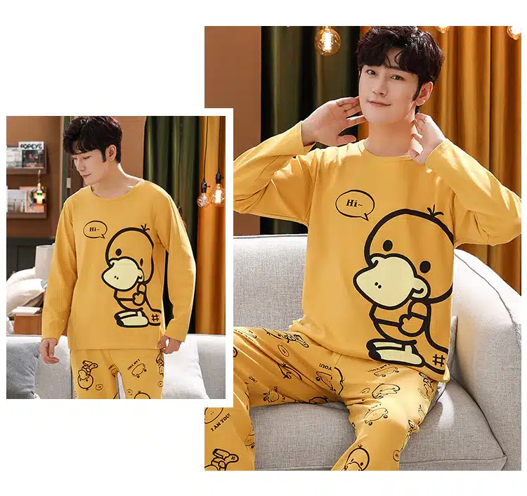 Découvrez notre pyjama à motif de canard jaune conçu pour égayer votre journée. Ce confortable pyjama en deux pièces présente un col rond et est entièrement fait de coton. Parfait pour une utilisation quotidienne, il fera également un excellent cadeau pour vos proches lors des prochaines fêtes.