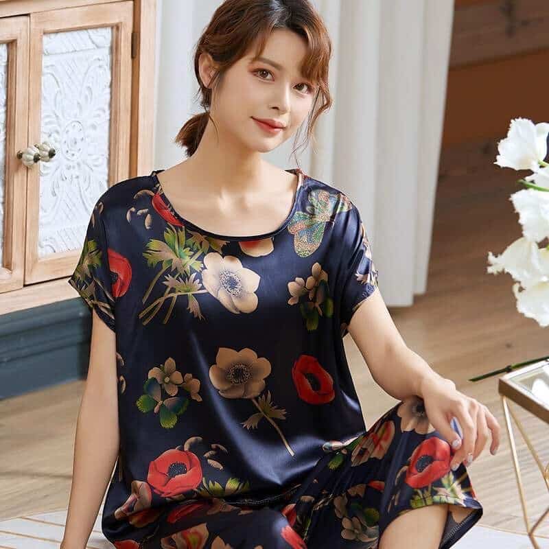 Pyjama bleu deux pièces en satin de soie à motif floral