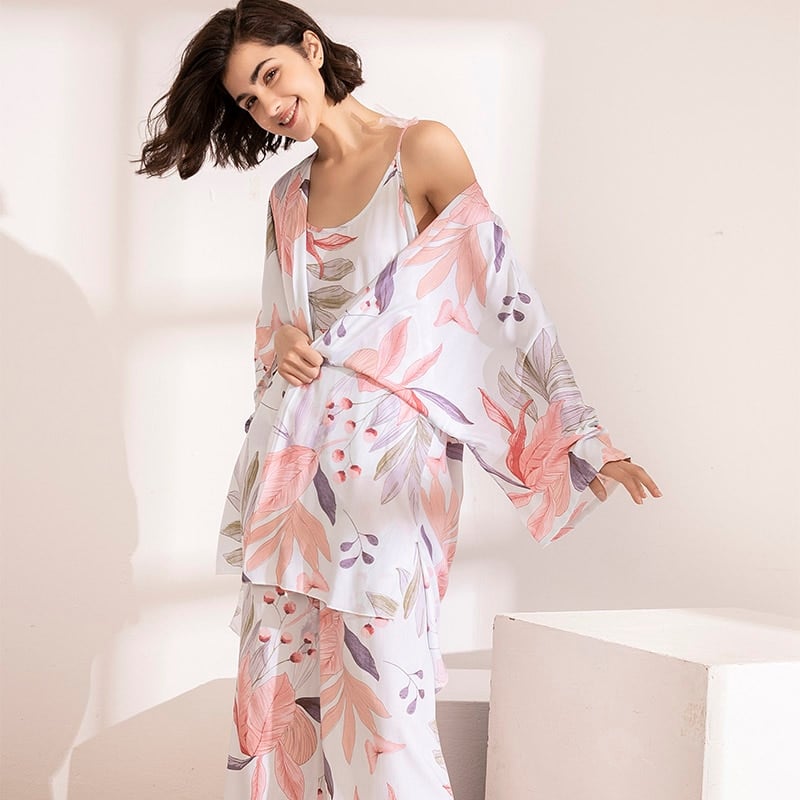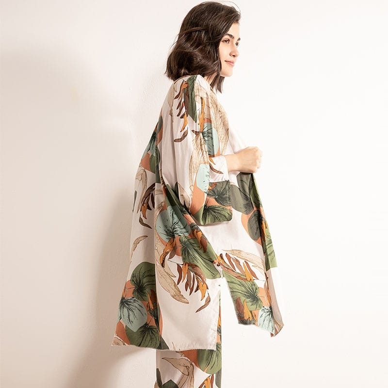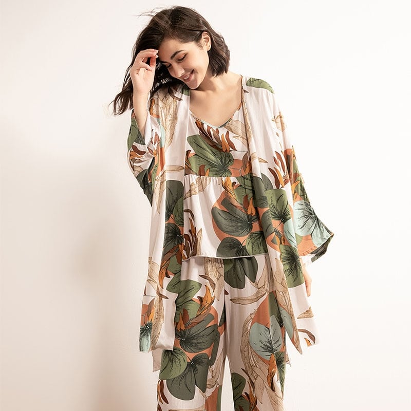Optez pour ce charmant ensemble pyjama trois pièces à motif floral. Il se compose d’un pantalon fluide, d’un débardeur à fines bretelles et d’un cardigan léger. Ce pyjama vous apportera une touche bohème au réveil, parfaite pour booster votre moral ! Commencez la journée du bon pied avec ces fleurs qui illuminent votre regard !