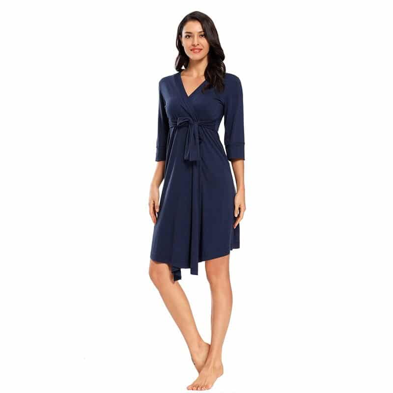 Admirez l’élégance de ce pyjama de maternité bleu : un vêtement raffiné qui illuminera votre grossesse de bonheur. Conçu comme une robe ajustable, il évolue avec les changements de votre ventre tout au long de la grossesse.