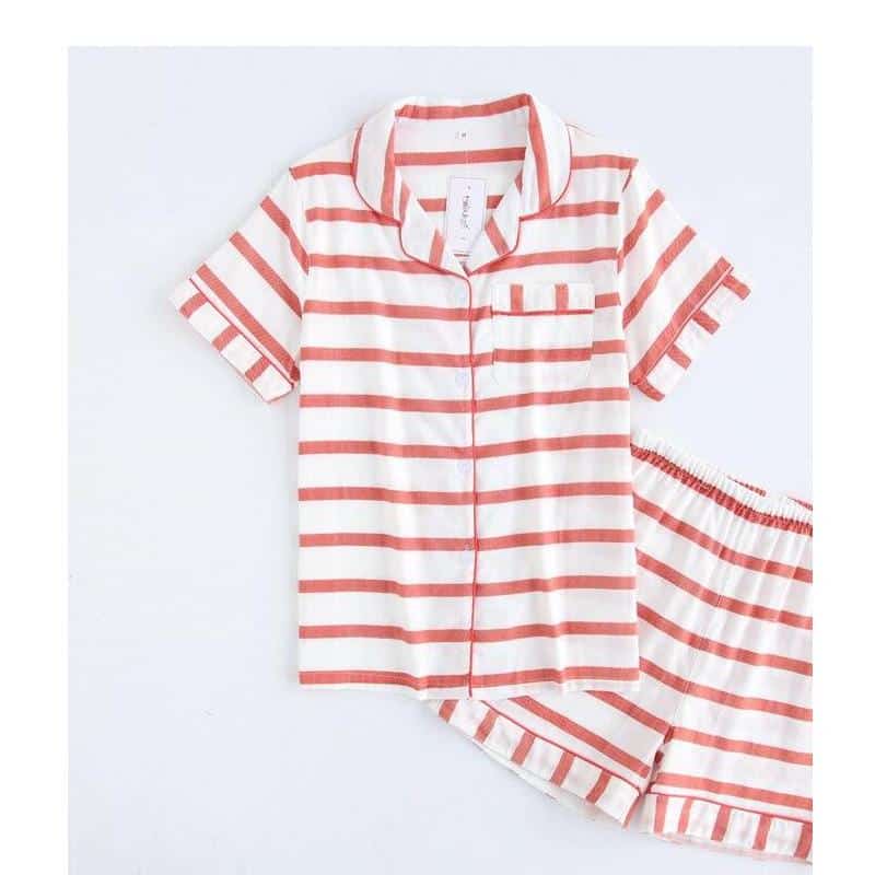 Dormez avec style grâce à ce magnifique pyjama à rayures rose et blanc. Parfait pour l’été, ce pyjama élégant pour femme mettra en valeur votre beauté naturelle. Son tissu doux et rafraîchissant vous promet des nuits paisibles.