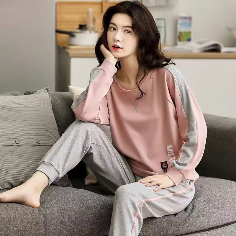 Pyjama d’été avec pull-over rose et pantalon gris pour femmes
