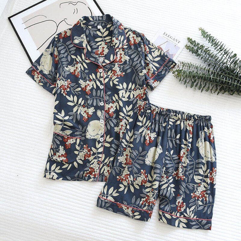 Pyjama d’été décontracté à manches courtes avec imprimé fleur tropicale et lapin