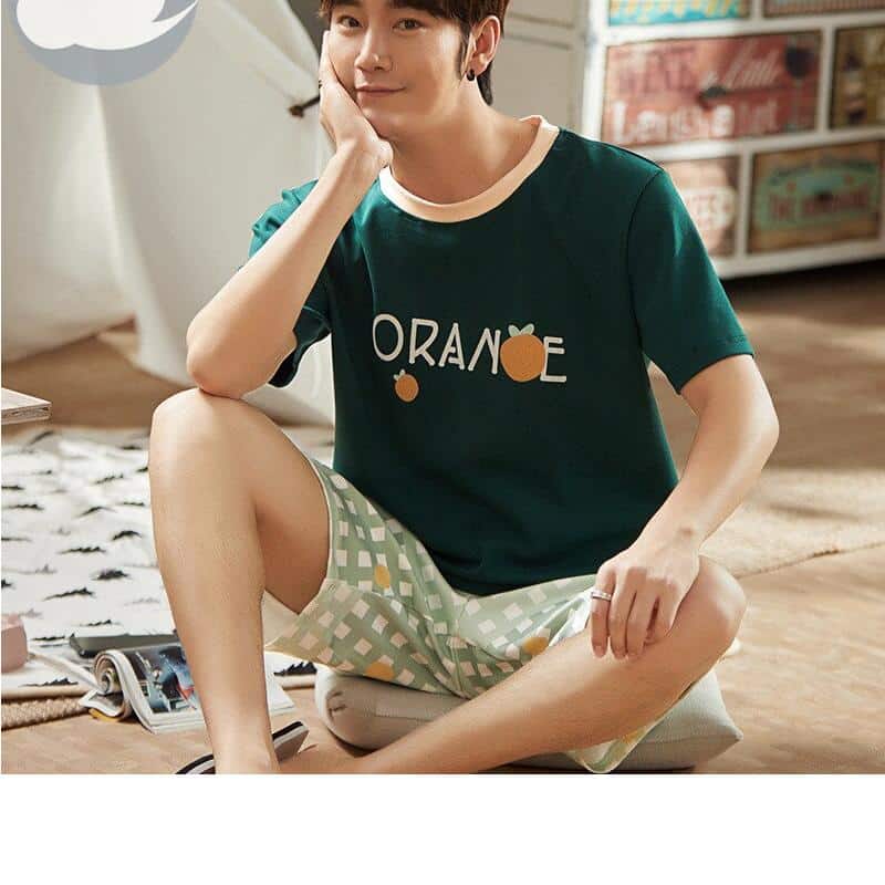 Pyjama d’été vert foncé à manches courtes et motif orange
