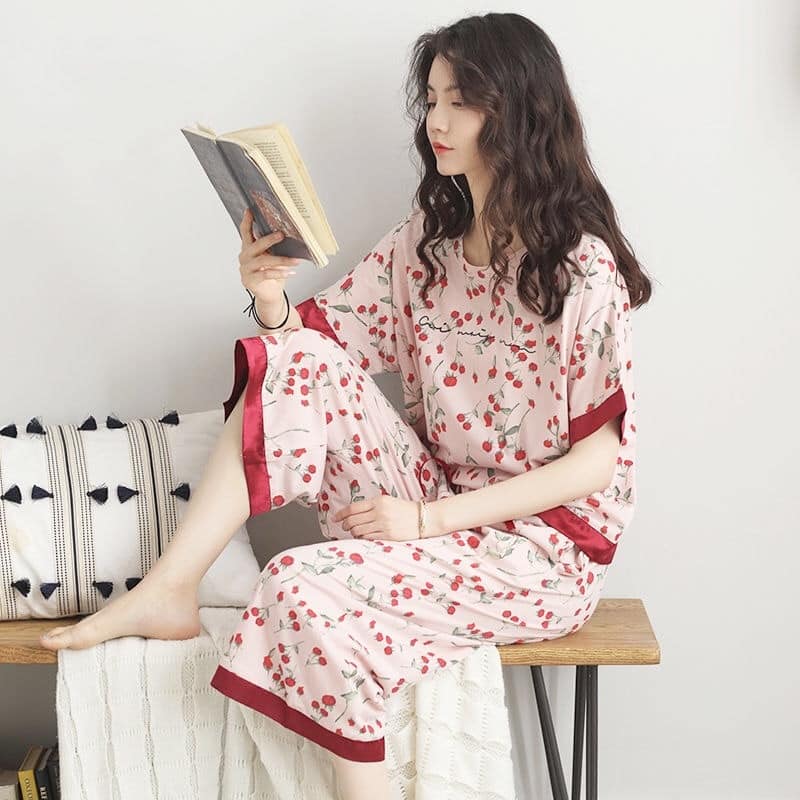 Pyjama femme à manche chauve-souris avec imprimé fleurs rouges