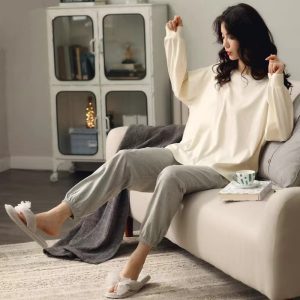 Pyjama d’été avec pull-over blanc manches chauve-souris et pantalon gris