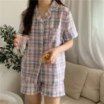 Pyjama manches courtes à motif carreaux bleu violet pour femmes