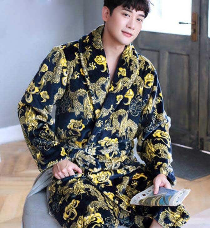 Ce pyjama de style kimono est un habit simple, confortable et pratique à enfiler lors de vos moments à domicile. Après une journée en tenue sophistiquée, vous ressentirez un soulagement en portant ce kimono pyjama orné de motifs dragons.