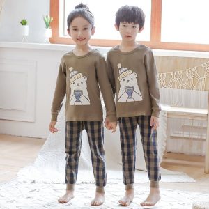 Pyjama printemps avec pull-over beige et pantalon carreaux pour enfants