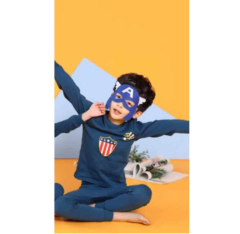 Votre petit souhaite incarner un super héros ? Et si vous exauciez son vœu, même juste pour quelques nuits ? Grâce à cet ensemble pyjama estival bleu en coton deux pièces, il pourra se transformer en Captain America le temps d’une nuit ou plus. Ce pyjama est idéal tant pour les nuits estivales que pour les moments de détente diurnes.