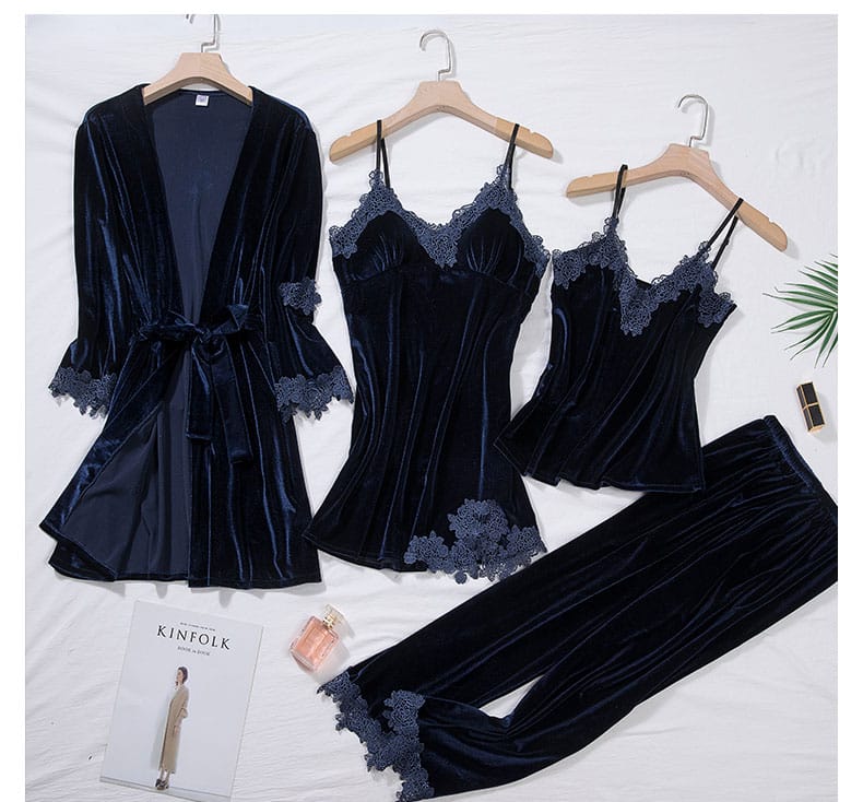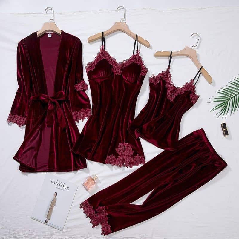Adoptez un look tendance et raffiné même durant les mois froids avec ce ravissant pyjama en velours. Grâce à son tissu douillet, vous passerez des nuits agréables et reposantes dans votre lit. Ce superbe ensemble de quatre pièces vous gardera au chaud. Disponible en quatre nuances diverses.