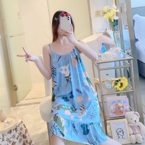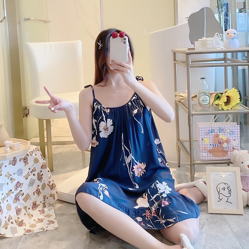 Pyjama robe de nuit bleu marine en coton à motif floral