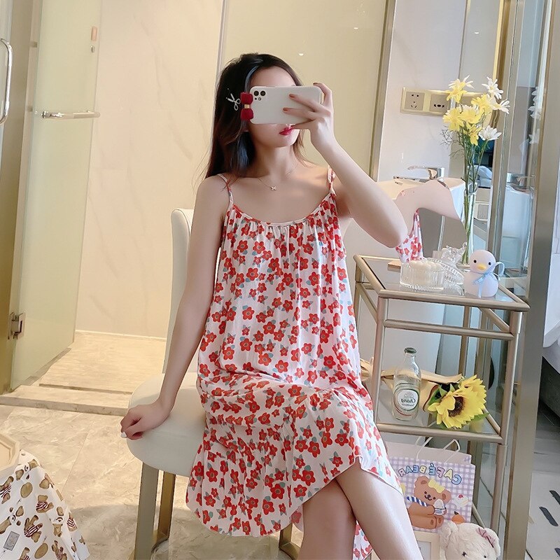 Pyjama robe de nuit en coton à motif fleur rouge